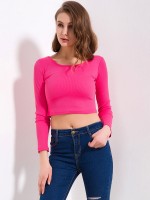 Pink Round Collar Long Sleeve Knit Cropped Tops