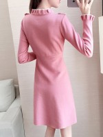 Pink Stand Collar Knit A-line Dress in Ruffle Detail
