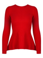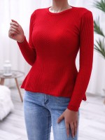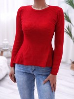 Red Crew Neck Long Sleeve Lotus Leaf Hem Sweater