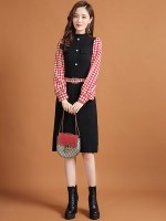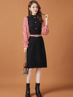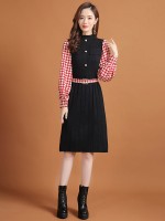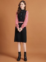 Red Lattern Sleeve Houndstooth Print Knitted Dress