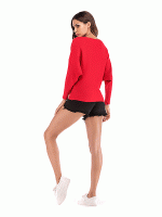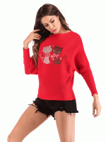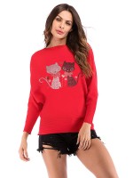 Red Oversize Cats Pattern Crew Neck Knitted Sweater