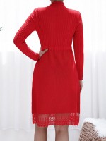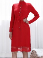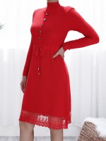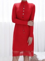 Red Stand Collar Ribbed Knit Dress with Button Detail