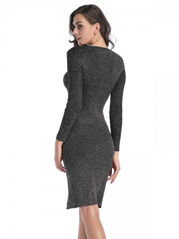 Grey V-neck Bodycon Knit Dresses With Puff Sleeves