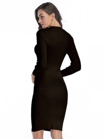 Brown V-neck Bodycon Knit Dresses With Puff Sleeves