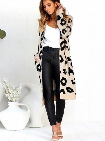 Khaki Oversize Maxi Knit Cardigan with Leopard Pattern