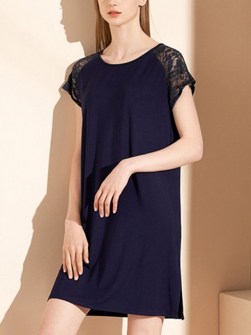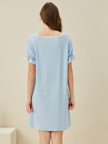 Blue V Neck Short Sleeves Nightdress with Pockets