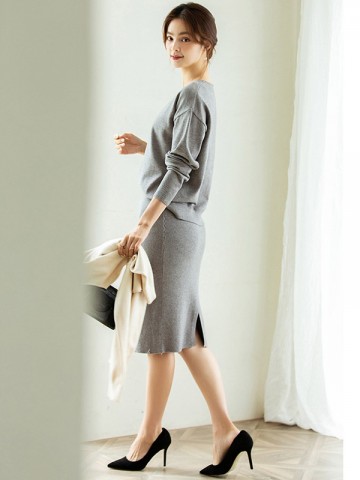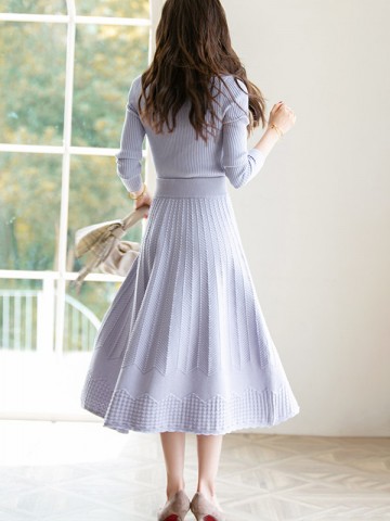 Grey V-neck Knitted Sweaters And Skirts Sets