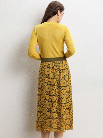 Yellow Lace Stitching Knit Sweater And Skirt Sets