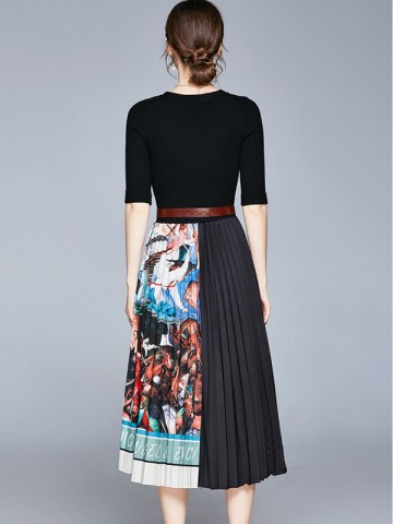 Black 3/4 Sleeve Knit Top Floral Print Pleated Dress