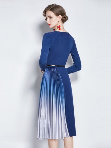 Blue Knitted Dress with Satin Pleated Skirt