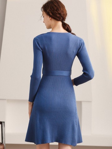 Blue Wrap Style Tie Waist Knitted Pleated Dress