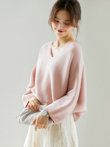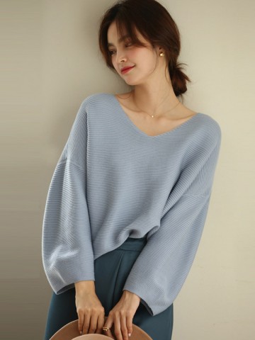 Blue Oversize V-neck Knit Sweaters With Stripes Patterns