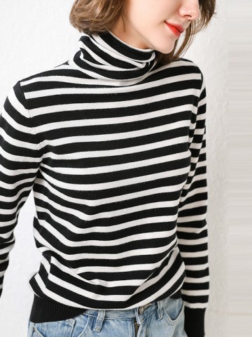 Yellow Funnel Neck Stripes Design Knit Sweaters