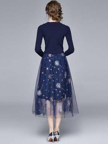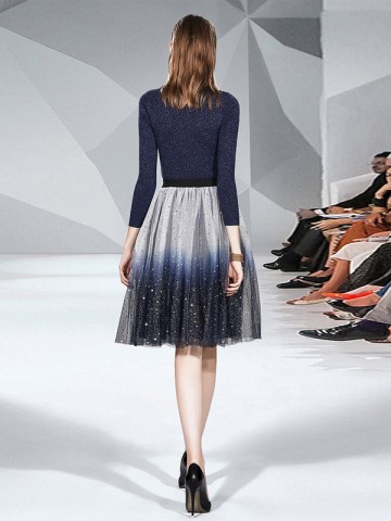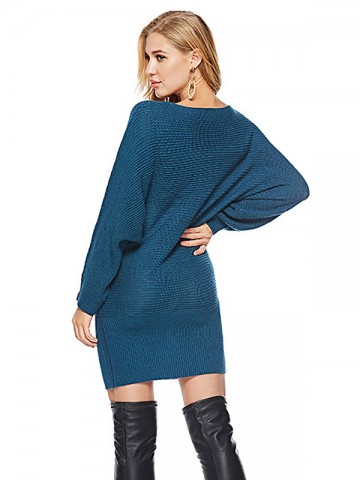 Blue Boat Neck Knit Dresses With Cape Sleeves