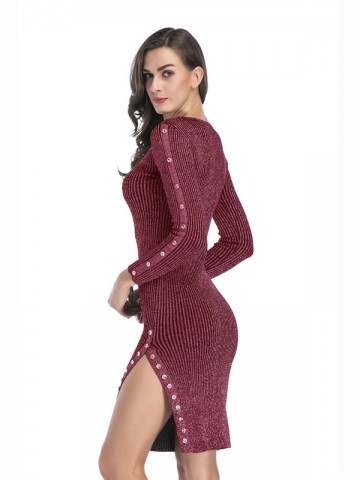 Burgundy Ribbed Bodycon Knitted Dress with Rivet Detail