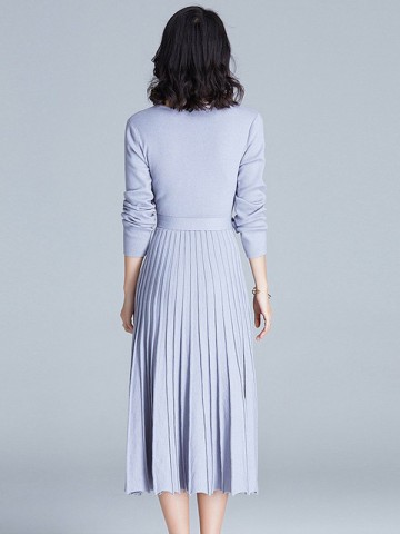 Blue Wrap Style Tie Waist Knitted Pleated Dress