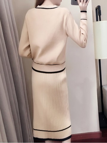 Black V-neck Knitted Sweater and Shift Skirt Sets
