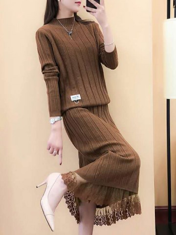 Dark Brown Stand Collar Knitted Top and Skirt in Lace Trim