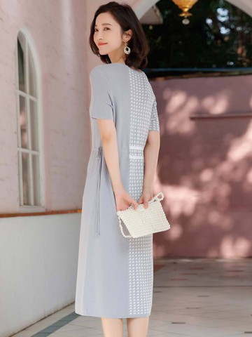 Grey Houndstooth Short Sleeves Midi Dress
