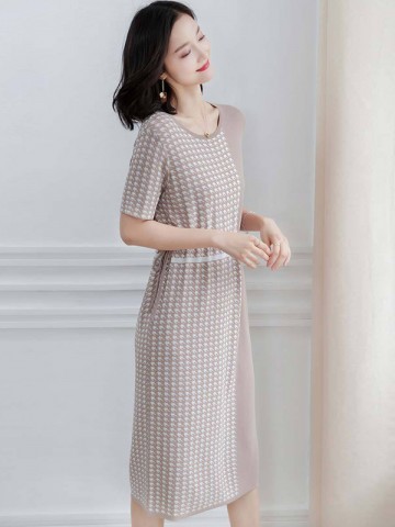Khaki Houndstooth Short Sleeves Midi Dress