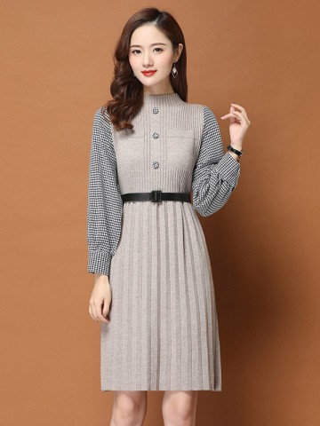 Khaki Stand Collar Flared Sleeve Knit Pleated Dress