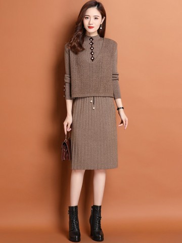 Khaki V Neck Sweater & Midi Dress 2 Piece Set
