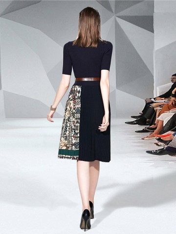 Black 3/4 Sleeve Knit Top Floral Print Pleated Dress