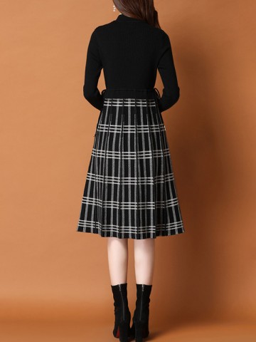 Brick Red Stand Collar Knitted Shift Dress in Check Print