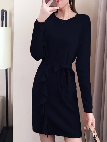 Navy Blue Point Collar Knit Dress in Stripe Detail