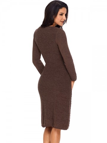 Brown Stand Collar Knit Midi Dress with Lace Hem