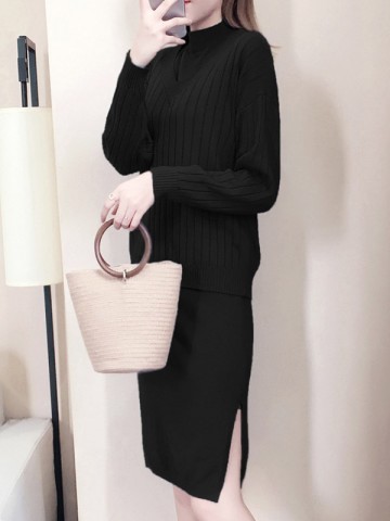 Khaki Crew Neck Ribbed Style Split Knit Dress