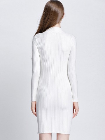 Red Stand Collar Ribbed Knit Dress with Button Detail