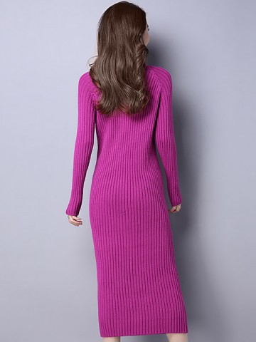 Fuchsia Stand Collar Ribbed Knitted Midi Dress