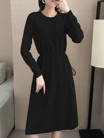 Black Knit A-line Pleated Dress in Ruffle Detail