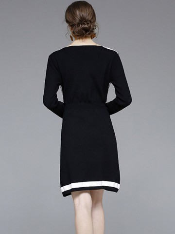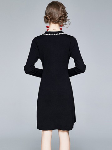 Black V-neck Knit Dress with Embroidery Trim