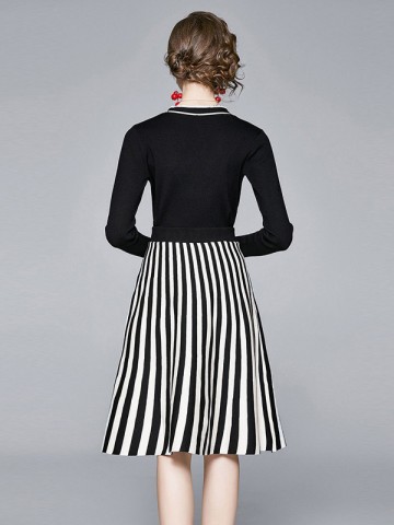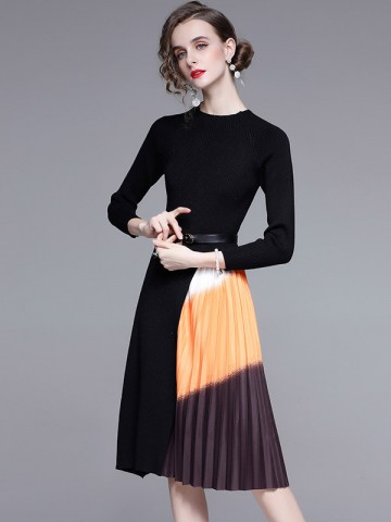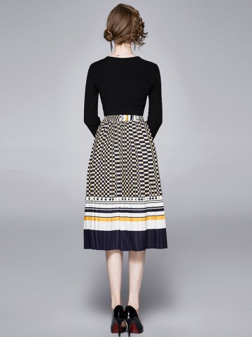 Black Knit Dress with Gradient Pattern Pleated Skirt