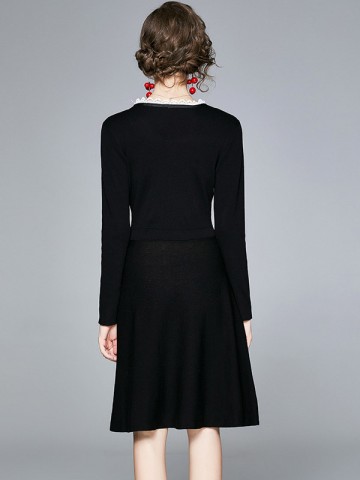 Black Round Neck Knit Dress with Lace Detail