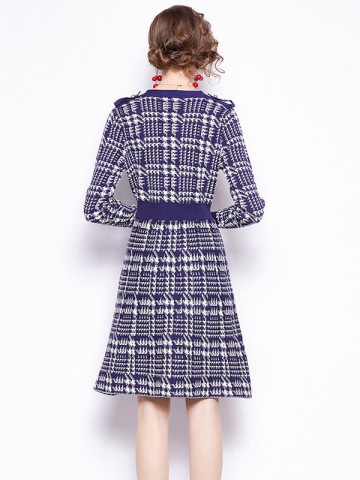 Navy Blue Round Neck Check Knit A-line Dress