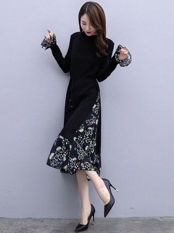 Black 3/4 Sleeve Knit Top Floral Print Pleated Dress