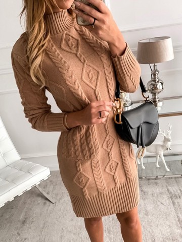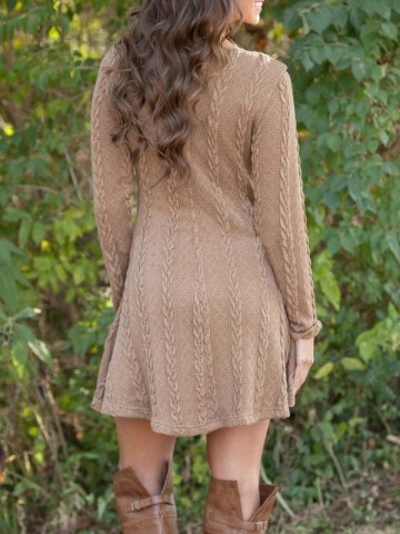 Khaki Cable Sweater Dress with Asymmetric Collar