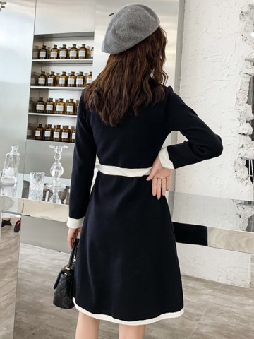 Navy Blue Round Neck Knitted Dress with Faux Pearl Button