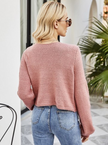 Pink Round Collar Long Sleeve Knit Cropped Tops