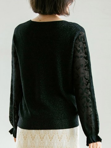 Black V Neck Lattern Sleeve Knitted Top