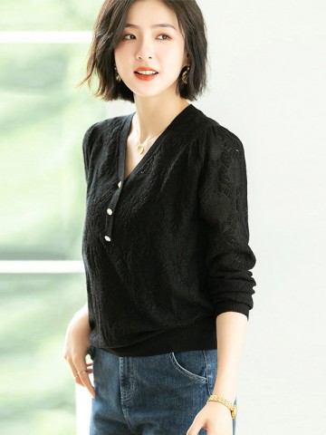 Black V-Neck Hollow-out Knit Top