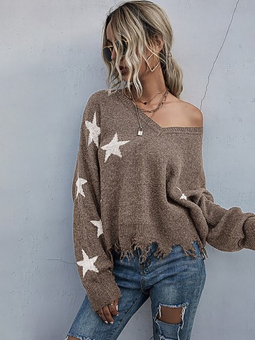 Khaki V-neck Printed Stars Pattern Knit Sweaters