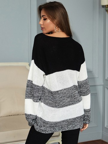 Khaki Oversize V-neck Knit Sweaters With Stripes Patterns