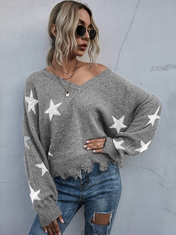 Purple V-neck Printed Stars Pattern Knit Sweaters