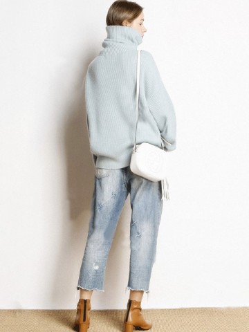 Green Loose Long Sleeve High Neck Knitted Sweater