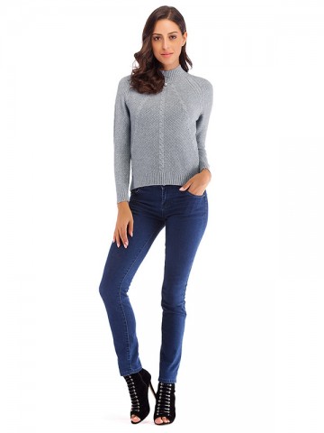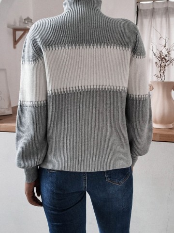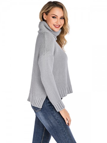 Grey Casual Lantern Sleeve High Neck Knitted Sweater