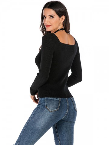 Black V-neck Fashion Knitted Wweater with Side Strap